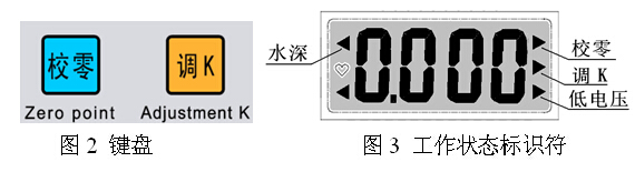 3、技术性能参数 量 程:0.000米~10.000米;0.00~20 米 误 差:±0.1%FS 分辨率:0.001米。 显 示:4 位液晶显示;工作电流:≤8mA 介 质:淡水、海水、污水等均可测量 电 源:9V方电池(型号:6F22) 4、键盘操作 参照图1、图2、图3进行下列操作。 (1)校零 传感器信号缆插头与仪器插座连接,传感器处于无水直立状态,按住“校零”键,打开电源开关,待液晶屏出现校零标识符(图3)的黑三角“”时,松开“校零”键,待液晶屏出现数字并蜂鸣器响一声,校零完毕,关断电源。当传感器未放入水中,打开电源,出现水深值时,应校零。 (2)调K 传感器信号缆插头与仪器插座连接,将传感器放入“校K桶”底部,加满水。按住“调K”键,打开电源开关,待液晶屏出现调K标识符(图3)的黑三角“”时,松开“调K”键,待液晶屏出现数字并蜂鸣器响一声,调K完毕,关闭电源。此功能主要是仪器长期放置,外出巡回测量前的室内线性度校正。