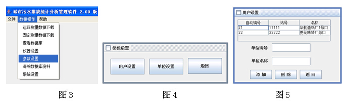 -2建立代码数据库 代码数据库就是各个测点的“单位编号”和与之对应的用排水“单位名称” 库。 双击软件图标“”运行程序,出现登录界面如图2 输入(开发商提供的)用户名和密码,打开仪器电源后,点击“登录”按钮,登录成功后进入下一级数据操作界面。若显示“没有找到可用设备,程序将在淡模式下运行!”表示登录失败,请拔掉仪器USB插头后重新插入计算机USB口,再次重复4-2过程。 点“数据操作”下拉菜单,点击“参数设置”如图3。 点击“单位设置”如图4